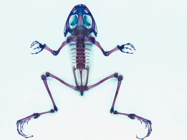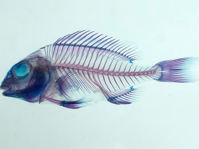透明標本は小さな生物の骨格研究のために開発された手法で、肉質を透明にし軟骨を青く硬骨を赤く染色するものです。
